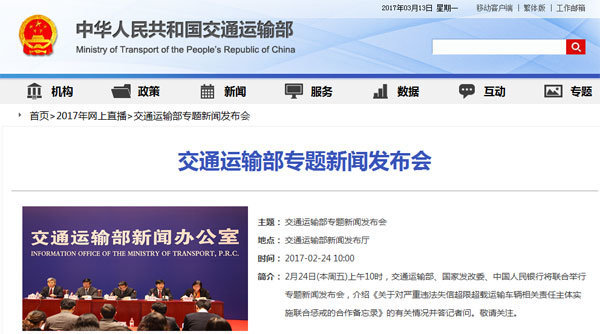 2017年2月24日上午10時,交通運(yùn)輸部舉行了本年度第一次例行新聞發(fā)布會,本次專題發(fā)布會由交通運(yùn)輸部、國家發(fā)改委、中國人民銀行聯(lián)合舉行,介紹《關(guān)于對嚴(yán)重違法失信超限超載運(yùn)輸車輛相關(guān)責(zé)任主體實(shí)施聯(lián)合懲戒的合...